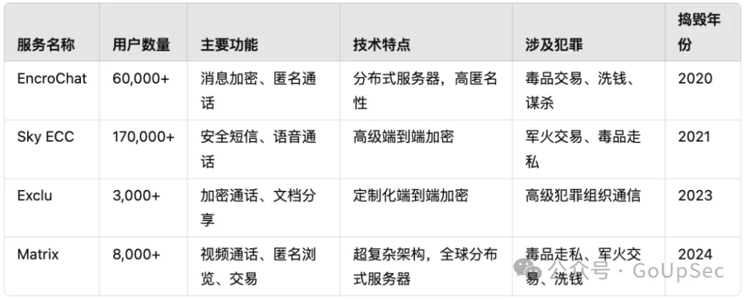 近年来,非法加密通信服务层出不穷,以下是被捣毁的主要加密服务的统计和特点分析: