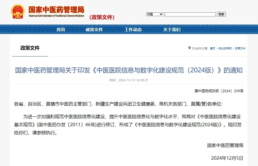 2、国家中医药局印发《中医医院信息与数字化建设规范 (2024版)》
