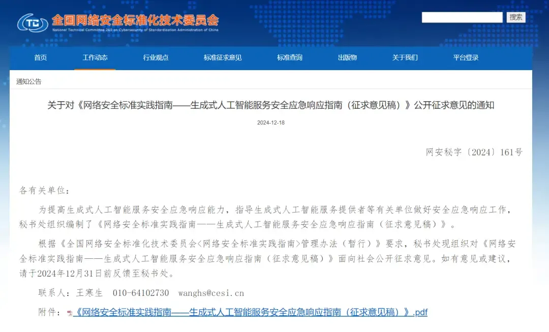 1、《网络安全标准实践指南——生成式人工智能服务安全应急响应指南》公开征求意见