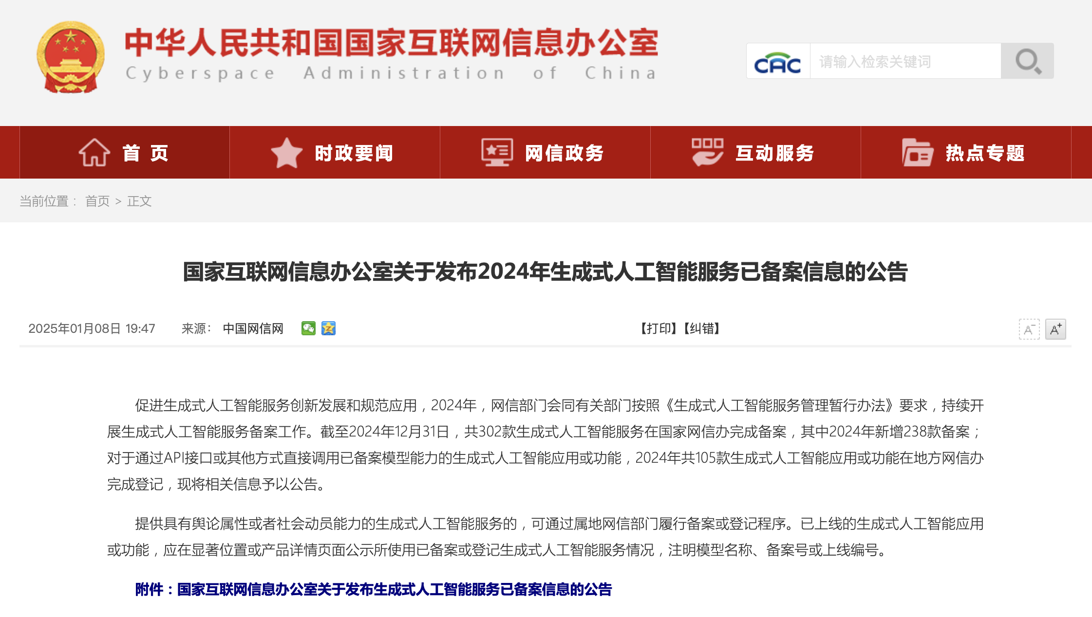 国家互联网信息办公室关于发布2024年生成式人工智能服务已备案信息的公告 |
