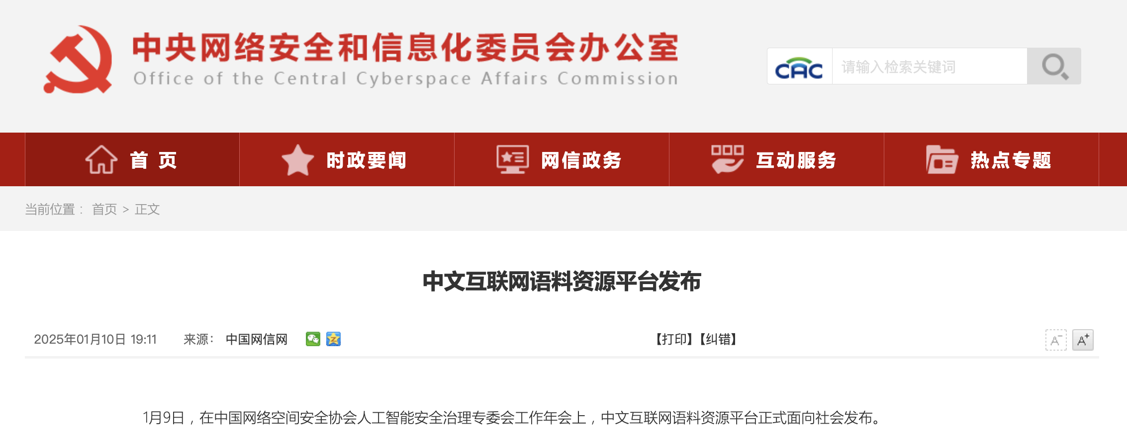 1月9日,在中国网络空间安全协会人工智能安全治理专委会工作年会上,中文互联网语料资源平台正式面向社会发布。