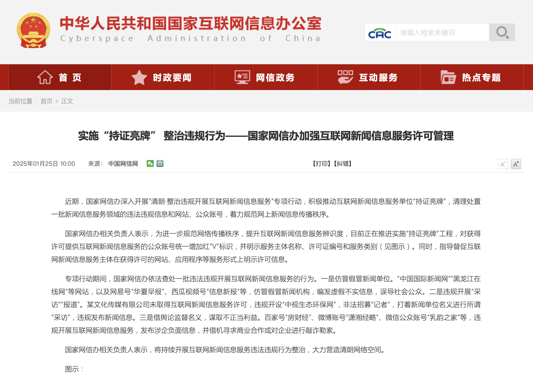 近期,国家网信办深入开展“清朗·整治违规开展互联网新闻信息服务”专项行动,积极推动互联网新闻信息服务单位“持证亮牌”,清理处置一批新闻信息服务领域的违法违规信息和网站、公众账号,着力规范网上新闻信息传播秩序。
