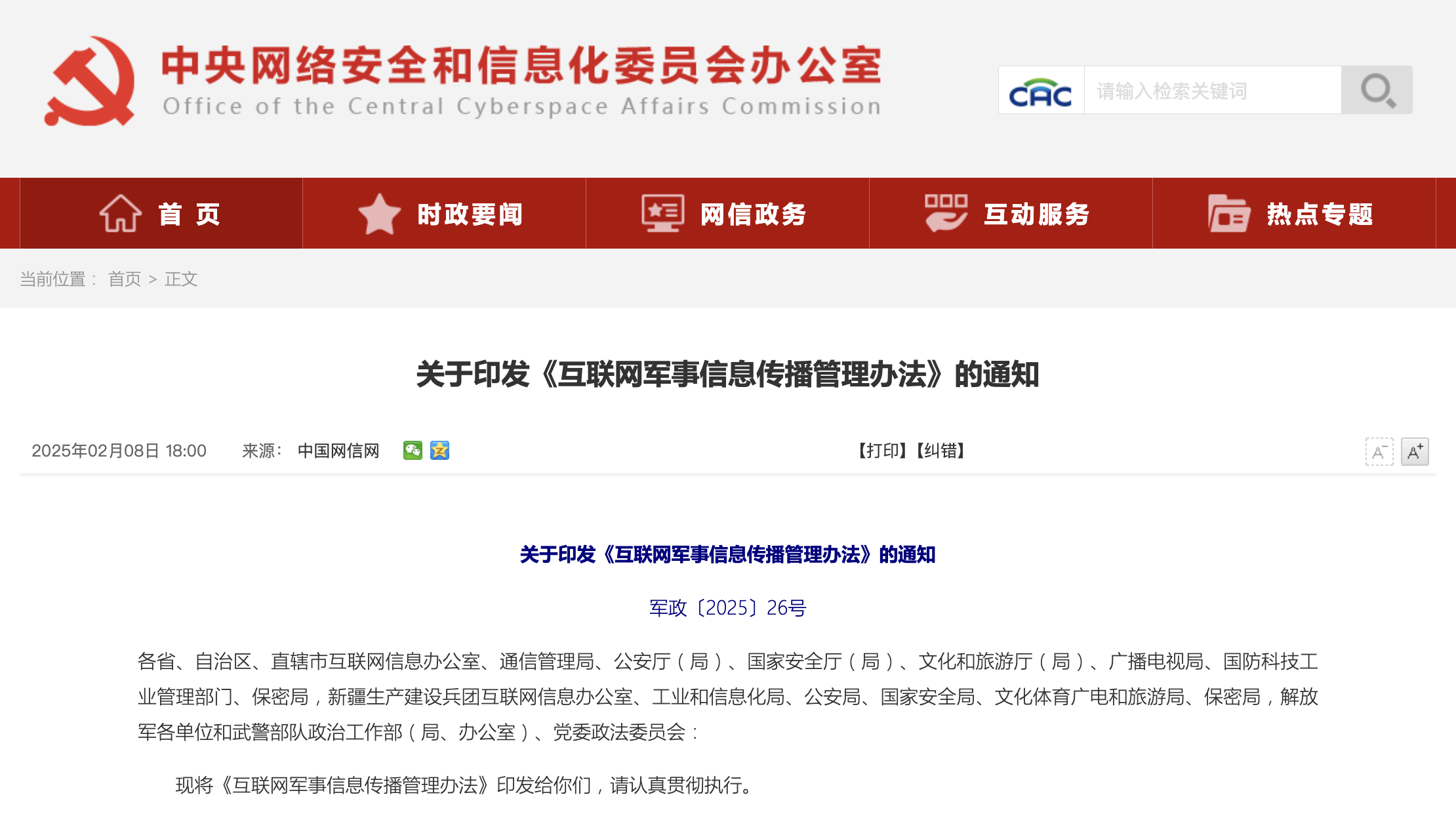 各省、自治区、直辖市互联网信息办公室、通信管理局、公安厅(局)、国家安全厅(局)、文化和旅游厅(局)、广播电视局、国防科技工业管理部门、保密局,新疆生产建设兵团互联网信息办公室、工业和信息化局、公安局、国家安全局、文化体育广电和旅游局、保密局,解放军各单位和武警部队政治工作部(局、办公室)、党委政法委员会: 现将《互联网军事信息传播管理办法》印发给你们,请认真贯彻执行。 国家互联网信息办公室 工业和信息化部 公安部 国家安全部 文化和旅游部 国家广播电视总局 国家国防科技工业局 国家保密局 中央军委政治工作部 中央军委政法委员会 2025年1月22日