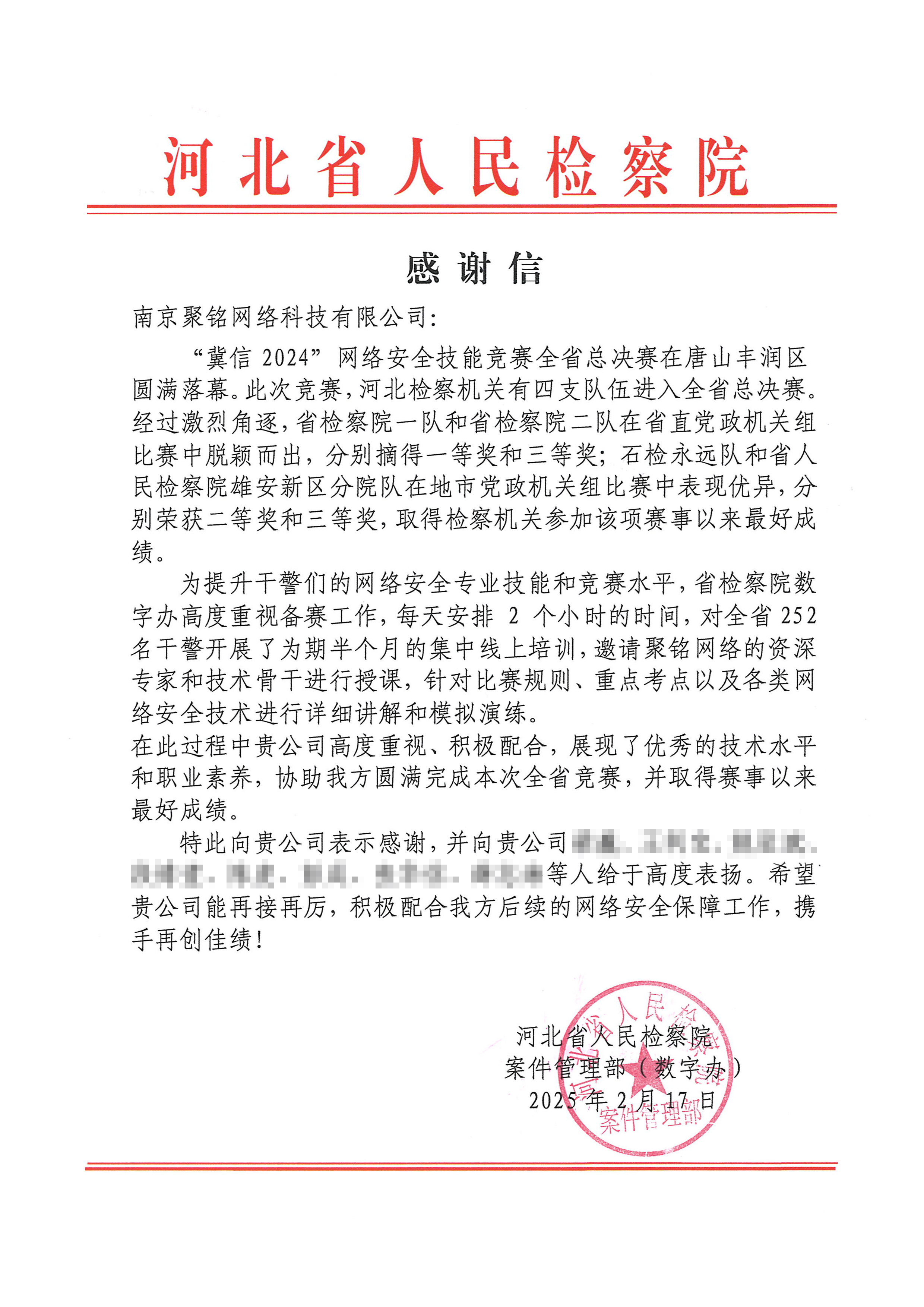 近日,聚铭网络收到河北省人民检察院的官方感谢函,表彰其在“冀信2024”网络安全技能竞赛中提供的专业技术支持。此次合作助力河北省人民检察院斩获省直党政机关组一、三等奖及地市组二、三等奖共四项大奖,创下该院参赛历史最佳战绩。