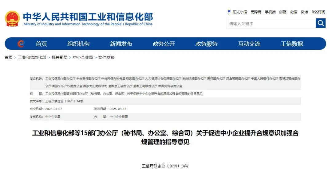 十五部门印发《关于促进中小企业提升合规意识加强合规管理的指导意见》