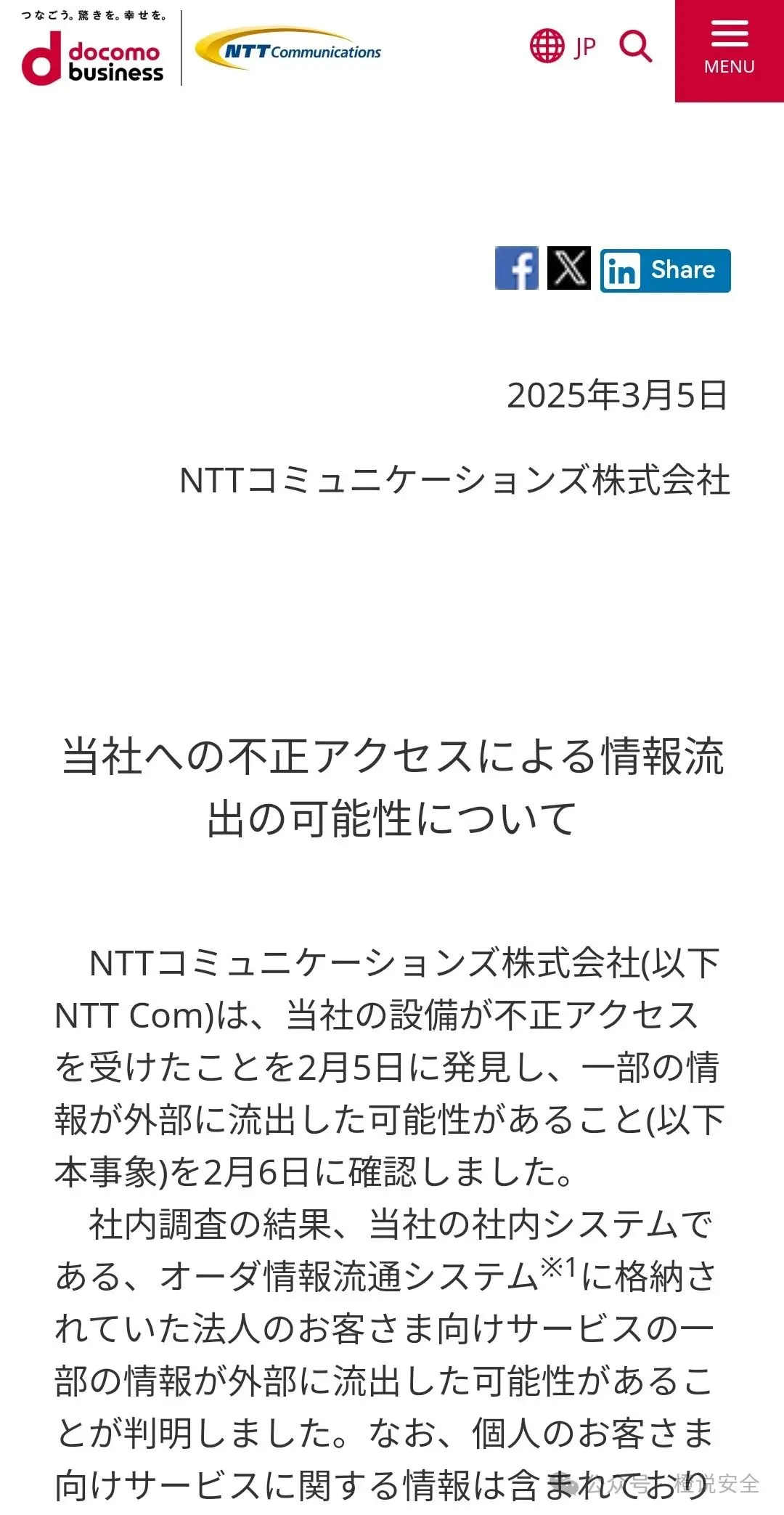 6、日本电信巨头NTT系统遭入侵,1.8 万企业客户信息恐遭被泄露