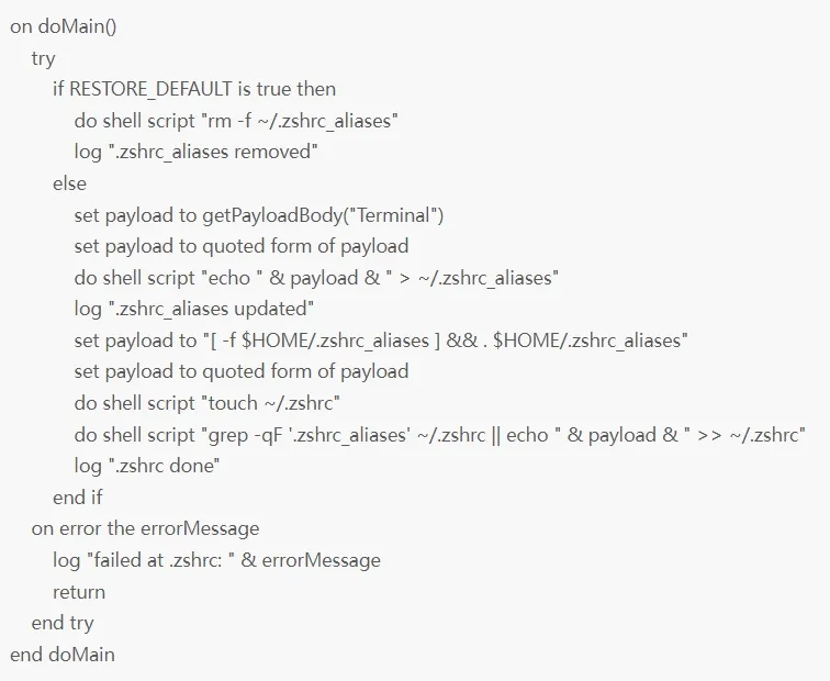 该恶意软件通过几种复杂的方法来实现驻留。其中一种方法是修改~/.zshrc 文件,以便在每次启动新的 shell 会话时执行恶意代码。