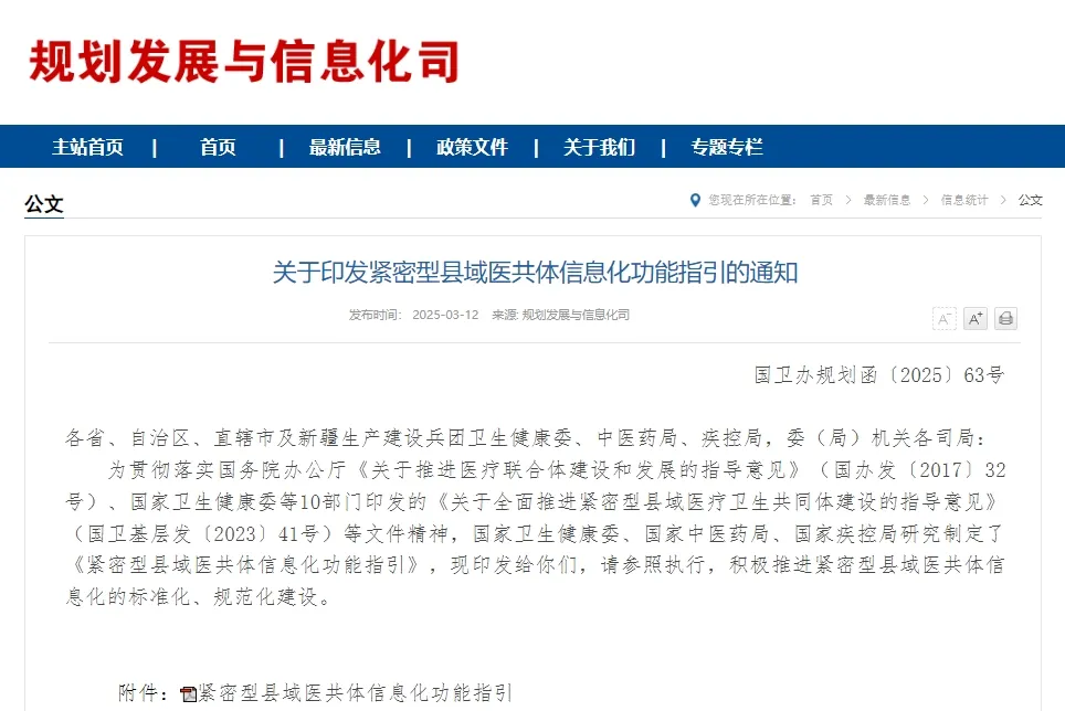 为贯彻落实国务院办公厅《关于推进医疗联合体建设和发展的指导意见》(国办发〔2017〕32号)、国家卫生健康委等10部门印发的《关于全面推进紧密型县域医疗卫生共同体建设的指导意见》(国卫基层发〔2023〕41号)等文件精神,国家卫生健康委、国家中医药局、国家疾控局研究制定了《紧密型县域医共体信息化功能指引》,现印发公布,请相关单位参照执行。