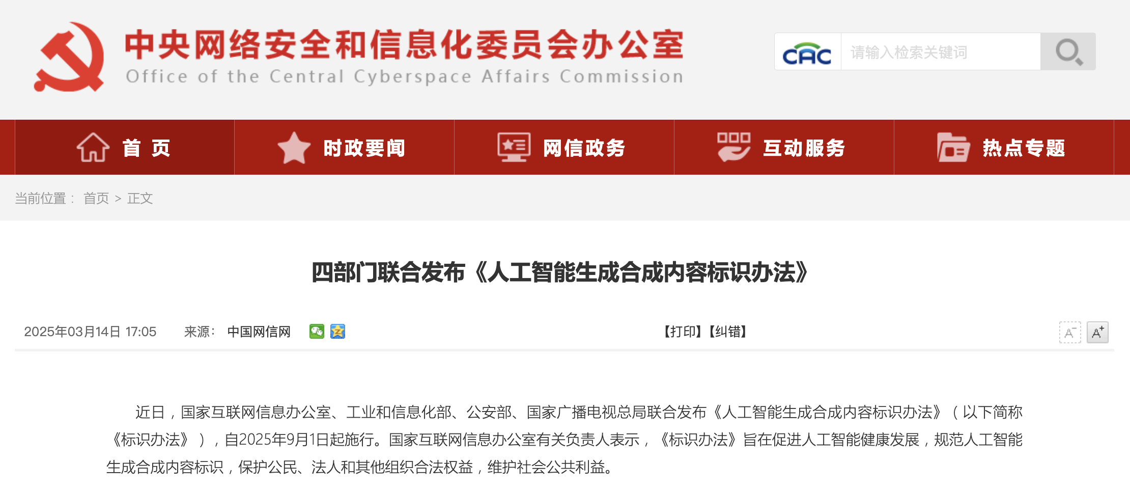 近日,国家互联网信息办公室、工业和信息化部、公安部、国家广播电视总局联合发布《人工智能生成合成内容标识办法》(以下简称《标识办法》),自2025年9月1日起施行。国家互联网信息办公室有关负责人表示,《标识办法》旨在促进人工智能健康发展,规范人工智能生成合成内容标识,保护公民、法人和其他组织合法权益,维护社会公共利益。