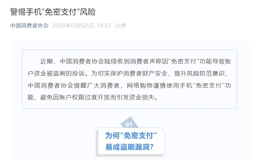 中国消费者协会3月25日发布消费提示,近期陆续接到消费者投诉,因“免密支付”功能导致账户资金被盗刷,提醒消费者谨慎使用“免密支付”功能,避免因账户权限过度开放而引发资金损失。