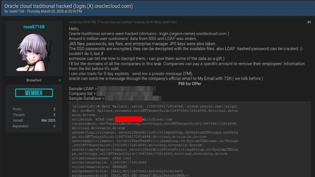 据CloudSEK安全研究团队报告,黑客rose87168声称已成功入侵Oracle云平台,窃取了600万条记录,可能影响超过14万个租户。该黑客自2025年1月开始活跃,声称已经入侵了一个子域login.us2.oraclecloud.com(目前已下线),并正在暗网论坛上出售窃取的敏感数据。