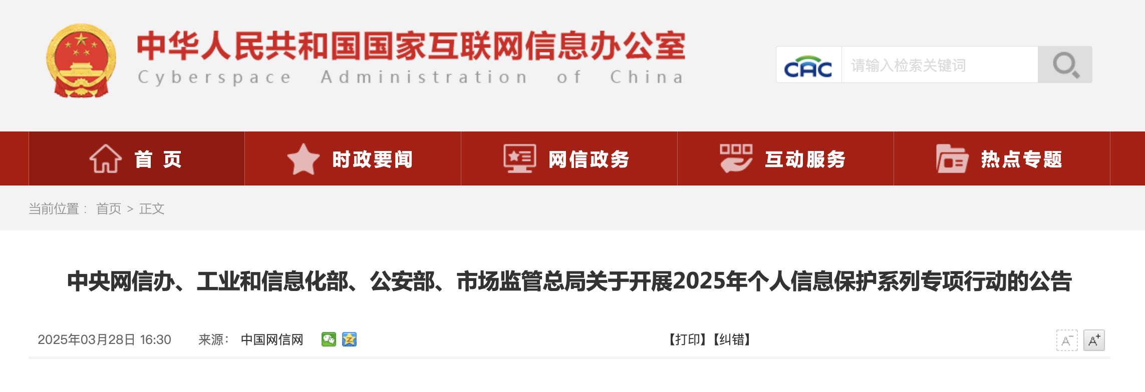 《中华人民共和国个人信息保护法》施行以来,中央网信办会同有关部门持续组织开展个人信息保护相关工作,建立健全工作机制,研究制定标准规范,依法依规查处各类违法违规行为,加强正面典型示范引领,督促指导个人信息处理者不断提升合规水平,取得了积极治理成效。2025年,中央网信办将会同工业和信息化部、公安部、市场监管总局等部门,进一步深入治理常用服务产品和常见生活场景中存在的违法违规收集使用个人信息典型问题,切实维护人民群众在网络空间合法权益,着力提升人民群众满意度、获得感。相关部门将围绕以下重点问题开展系列专项行动: