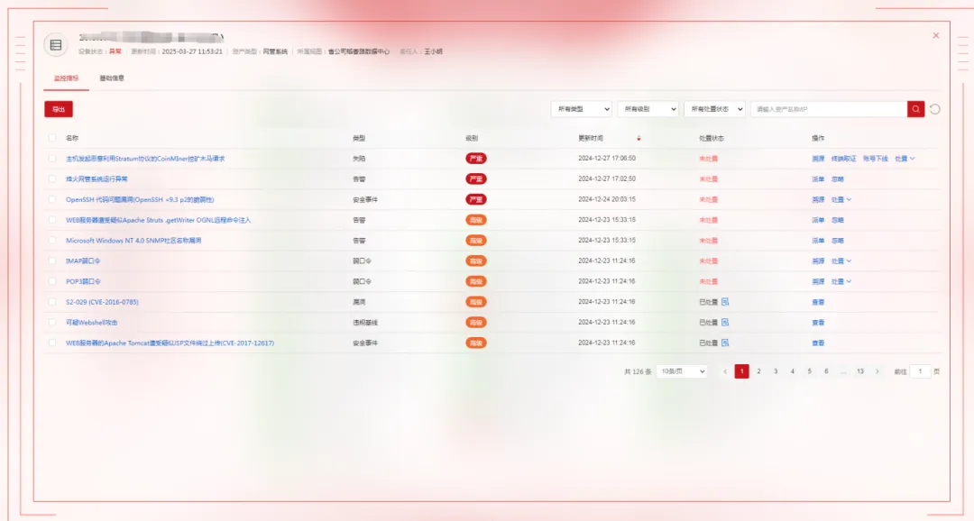 2、移动端处置:支持查看详情、确认告警、下发处置指令,随时随地处理问题;