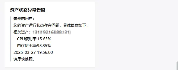 2、阈值预警:可自定义阈值,资源使用异常时自动触发告警(如CPU持续超80%);