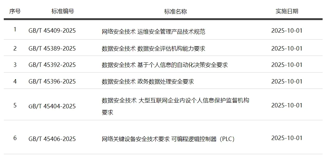 根据2025年3月28日国家市场监督管理总局、国家标准化管理委员会发布的中华人民共和国国家标准公告(2025年第6号),全国网络安全标准化技术委员会归口的6项国家标准正式发布。具体清单如下: