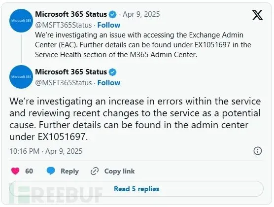 FREEBUF 4月10日消息,微软已确认Exchange管理中心(Exchange Admin Center,EAC)发生全球性服务中断,导致管理员无法访问关键管理工具。该故障被标记为关键服务事件(编号EX1051697),对依赖Exchange Online的企业造成广泛影响。