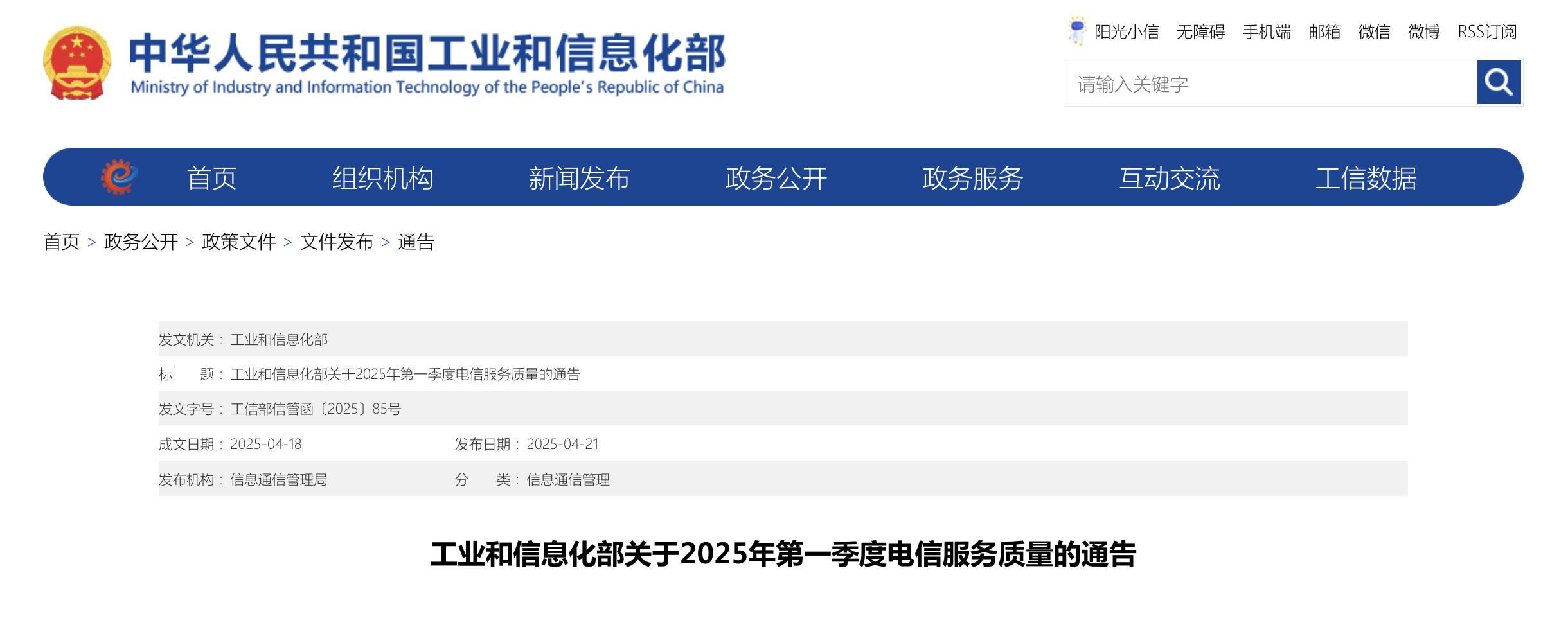 根据《中华人民共和国电信条例》《电信服务质量监督管理暂行办法》等相关规定,现将2025年第一季度电信服务有关情况通告如下:
