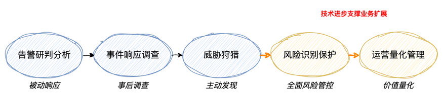 传统SOC的挑战 具体主要的挑战包括: 1. 人工处理面临效率低、响应慢、工作量大等挑战传统SOC团队在人工处理安全事件时面临诸多挑战,严重影响了安全运营的效率和效果。首先,海量数据处理存在明显局限性。传统SOC依赖安全设备产生的告警,但这些告警中存在大量误报,导致安全分析人员疲于奔命,难以从中准确识别出真正的威胁,从而降低了安全运营的整体效率,无法满足对真正威胁的快速响应需求。其次,人工响应速度慢且效率低下。传统SOC主要依靠人工进行安全事件的响应,这种方式难以满足快速响应的要求,导致安全事件的影响范围扩大,进而造成更大的损失。此外,安全人员数量不足也是一个突出问题。传统SOC的安全运营高度依赖安全专家的经验,对人员的技能要求很高,且难以形成统一的标准,这使得安全运营水平参差不齐,难以保证安全运营的整体质量。 2. 安全数据面临统计分析的挑战传统SOC在应对安全数据爆炸式增长时面临诸多挑战。首先,数据孤岛问题严重,不同安全设备和系统产生的数据分散在各个平台,难以进行统一分析和利用。其次,有效数据提取困难,安全数据中存在大量噪声和无关信息,从海量数据中提取有价值信息成为一大挑战。此外,传统SOC的数据处理能力不足,主要依靠人工分析或基于关系型数据库的SIEM平台,难以应对海量数据,导致安全分析效率低下,无法及时发现威胁。最后,传统SOC缺乏有效的数据关联分析能力,难以从海量数据中发现隐藏的关联关系和攻击模式,无法识别复杂攻击事件,难以进行攻击溯源。 3. 面临网络安全威胁复杂化的挑战传统SOC在应对复杂安全威胁时存在明显不足。首先,高级威胁检测能力不足,传统安全设备依赖规则和签名检测,难以识别APT攻击、0day漏洞利用、无文件攻击等高级威胁,导致组织无法及时发现这些威胁,容易遭受攻击,进而引发数据泄露、系统瘫痪等严重后果。其次,威胁情报缺乏有效利用,传统SOC要么无法充分利用威胁情报,要么仅能进行简单的IOC比对,难以深入理解威胁情报背后的脉络信息,无法识别复杂攻击事件,也无法进行攻击溯源和攻击者画像,难以全面了解攻击者的意图和攻击手段,从而无法进行有效防御。此外,传统SOC缺乏针对内部威胁的有效检测手段,主要关注外部攻击,而对内部威胁(如恶意内部人员、被盗用的账户等)的检测能力不足,内部威胁往往能够绕过传统安全控制措施,造成更大的威胁,导致数据泄露、系统破坏等严重后果。最后,攻击溯源和取证困难,高级攻击潜伏时间长,攻击者会采取各种手段掩盖攻击痕迹,使得安全事件的溯源和取证变得非常困难。 4. 安全面临业务发展的挑战在业务快速迭代的行业,安全面临着难以跟上业务更新速度的挑战。同时,随着组织上云和数字化转型的推进,新的安全挑战不断涌现,例如云安全、数据安全和隐私保护等。此外,安全部门常被视为成本中心,其对业务的价值贡献难以体现。 SOC安全运营业务的演变SOC正面临业务范围的扩展和技术进步支撑的能力升级,业务需求驱动了技术发展,技术的进步支撑了业务扩展。 SOC业务范围正在从事件研判分析、响应调查,向全面风险管理、运营量化管理等领域延伸。