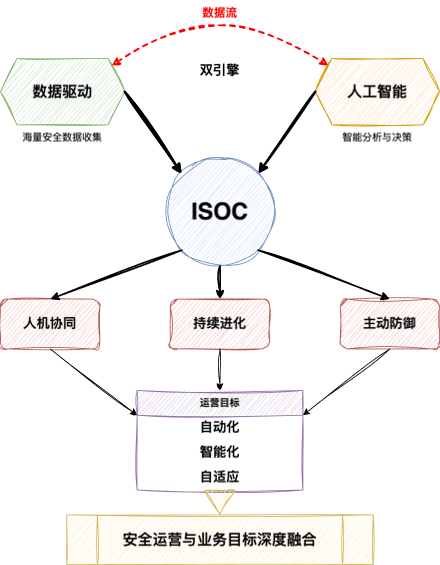 ISOC的理念智能安全运营中心(Intelligentization Security Operations Center,简称ISOC)的核心理念是数据驱动和人工智能双引擎,构建人机协同、持续进化的主动防御体系,目标是运营的自动化、智能化和自适应,最终实现安全运营与业务目标的深度融合。