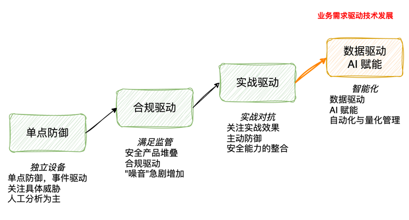 SOC的业务范围扩展 SOC的能力从单点防御到合规驱动,再到实战驱动,走向数据驱动、AI赋能的智能化阶段。