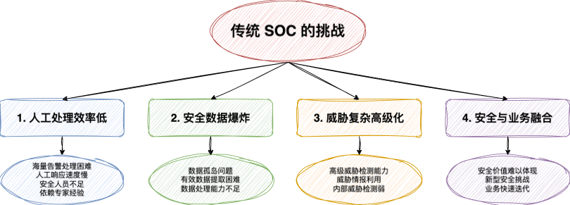 当前,企业IT环境极其复杂,云服务、物联网设备等的广泛应用,使得企业的网络边界模糊,攻击面不断扩大。与此同时,网络攻击手段不断升级,组织正面临着日益严峻的网络安全威胁和日益严格的安全监管与合规要求,传统安全运营已经力不从心,推动安全运营向更智能、更主动、更高效的方向发展。 传统SOC的挑战安全运营管理主要结合技术、流程和人员等能力,传统SOC主要通过人工进行技术处理、手动处理流程或独立的工单系统、各级分析师人工分析,实现对安全威胁的检测分析和事件响应,满足组织对安全风险管控的要求。然而,日益复杂和不断更新的安全威胁对安全运营能力提出更高的要求,传统SOC无法应对。