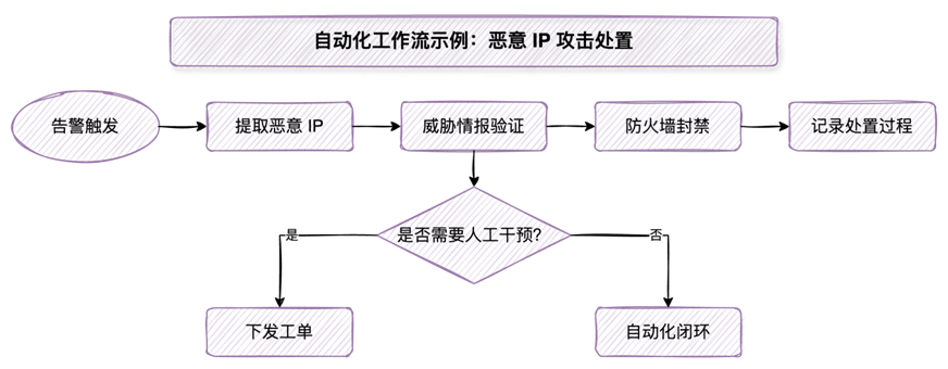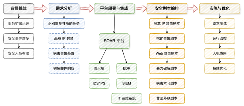 安全建设过程 首先该公司识别了日常安全运营中重复性高、耗时且易出错的环节作为自动化的重要应用场景,例如恶意IP的封禁、病毒告警的初步处置、钓鱼邮件的响应等。 在此基础上选择并进行SOAR平台的部署,选择平台时重点关注平台的集成性,确保其能够与目标场景需要的安全基础设施(如防火墙、EDR终端安全系统、入侵检测系统、SIEM系统等)以及IT运维系统进行对接,利用安全组件提供的开放接口,将SOAR平台作为指挥枢纽,协调和调度各类安全工具执行自动化动作. 在完成平台的基础部署和集成后,公司针对重要应用场景定义和编排安全剧本。基于预先制定的安全事件处置预案,利用可视化流程编辑器,将人工分析和处置步骤配置为标准化的自动化工作流程。例如,针对检测到的恶意IP攻击场景,创建恶意IP的封禁剧本,该剧本能够自动从告警列表中提取恶意IP信息,然后联动防火墙下发封堵策略,并记录整个处置过程。对于挖矿告警剧本,剧本可以自动将相关信息发送至EDR系统进行风险验证,并根据EDR的反馈联动防火墙封禁相关的域名或IP地址。为了应对不同的安全事件类型,持续开发了一系列的自动化剧本,覆盖了如Web攻击、暴力破解、病毒木马、非法外联、漏洞利用等常见威胁。