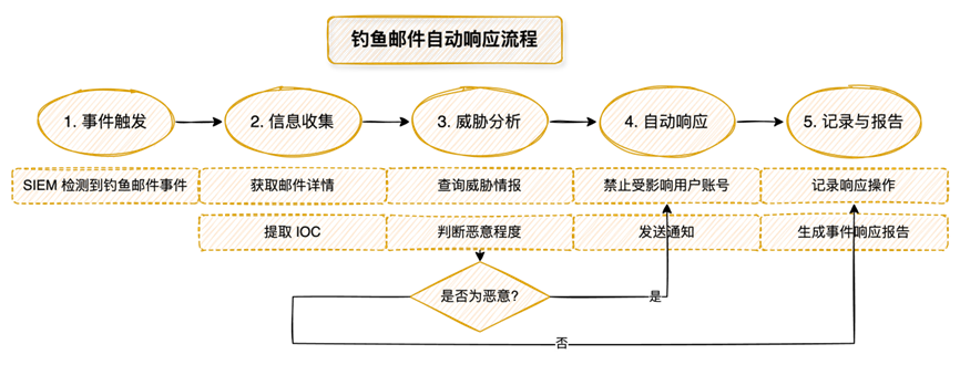 为了保证自动化响应的可靠性,在剧本上线前进行了充分的测试,并进行监控和调优。此外,因为意识到自动化并非适用于所有场景,因此SOAR平台也支持手动触发和人工干预,对于需要人工判定的复杂事件或未知事件,SOAR平台通过下发工单并提供执行概览,协助人工判断与执行。通过SOAR平台的应用,该公司显著提升了安全事件的响应速度和准确性,减轻安全运营人员的工作量,最终实现安全事件响应流程的自动化闭环。随着经验的积累,后期准备基于SOAR平台开发更复杂的自动化评估,例如与威胁情报集成形成自动化威胁狩猎剧本、与漏洞管理系统集成形成自动化漏洞处置剧本. 公司建某电商企业的SOAR应用实践:自动化响应钓鱼攻击设案例案例概况 某电商企业作为互联网行业的典型代表,面临着日益复杂和频繁的网络安全威胁,尤其是钓鱼邮件攻击。钓鱼邮件攻击不仅可能导致用户数据泄露,还可能引发更严重的安全事件,如账户被盗用、恶意软件传播等,对企业的声誉和业务运营造成严重影响。为了有效应对这些威胁,提升安全运营效率,降低数据泄露风险,该电商企业决定引入SOAR平台,实现钓鱼邮件攻击事件的自动化响应。