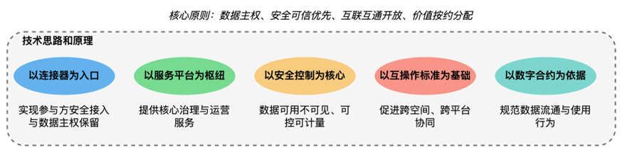 可信数据空间的核心技术与架构可信数据空间保障的技术架构设计遵循“数据主权、安全可信优先、互联互通开放、价值按约分配”等基本原则。 1.技术思路和原理