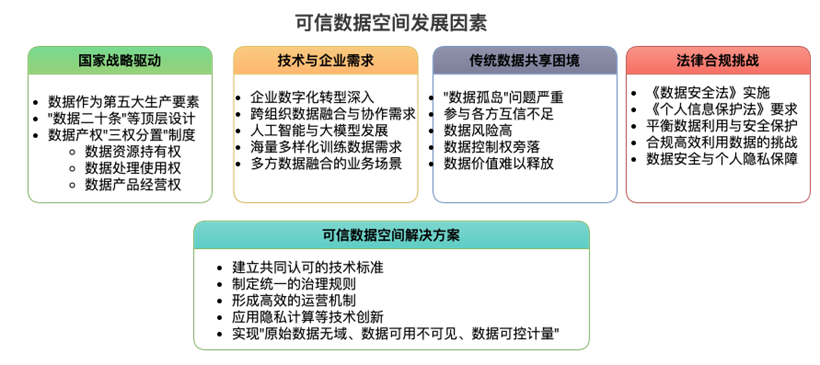 在数字经济的浪潮中,数据已然成为与土地、劳动力、资本、技术并驾齐驱的第五大生产要素。然而,数据的真正价值往往被锁在孤岛之中,难以释放其变革性潜能。如何在保障数据安全与隐私的前提下,让数据安全流动并创造价值?这一挑战正在通过"可信数据空间"这一创新基础设施得到突破性解决。 可信数据空间是对要素数据市场的市场化配置改革中深层次制度性障碍的积极响应,是推动“数据二十条”等国家数据战略落地,实现“原始数据不出域、数据可用不可见、数据可控可计量”,赋能千行百业,最终提升国家数字经济竞争的关键举措。