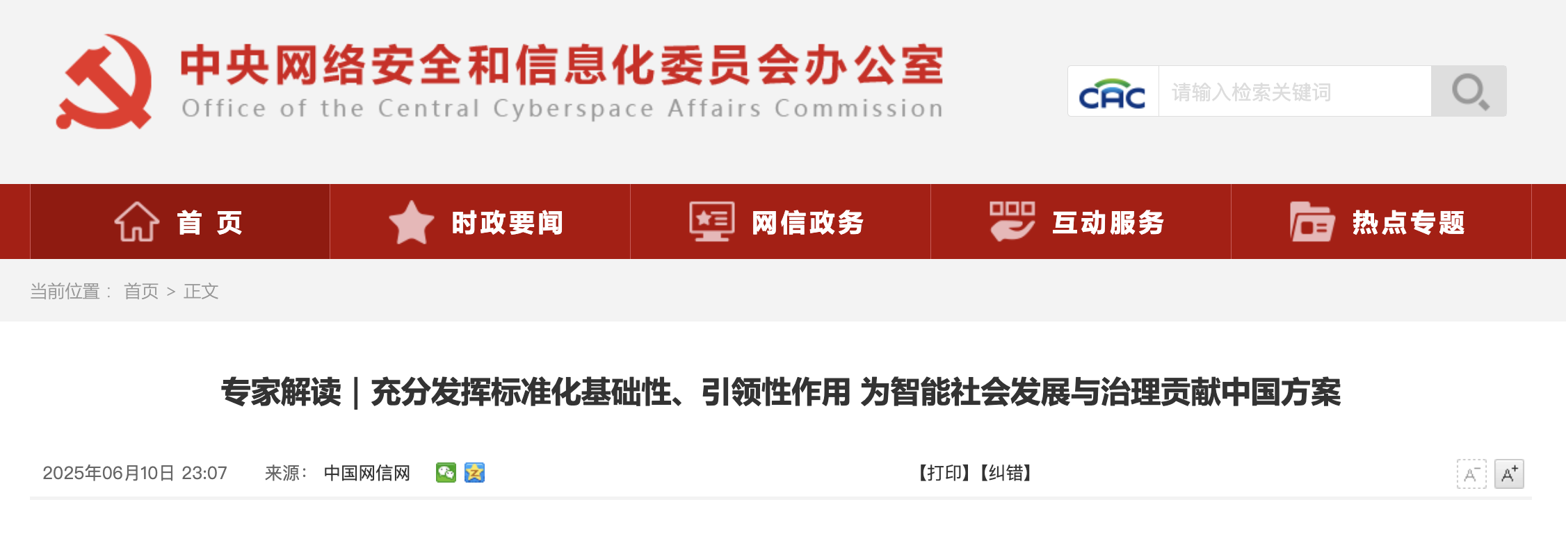 当前,全球智能技术快速发展,带来巨大机遇的同时也产生各种风险和挑战。国际社会正加快探索推动智能技术发展和应用、强化风险防范的治理路径,标准化成为其中重要议题。党的十八大以来,以习近平同志为核心的党中央高度重视智能社会发展与治理,指出要加强人工智能同社会治理的结合。近日,为贯彻习近平总书记重要指示批示精神,落实国家战略部署,中央网信办秘书局联合市场监管总局办公厅印发《智能社会发展与治理标准化指引(2025版)》(以下简称《指引》),旨在加快形成智能社会发展与治理标准体系,充分发挥标准化基础性、引领性作用,具有里程碑意义。
