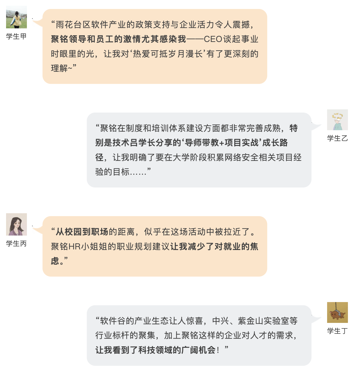 作为雨花台区产业生态的一份子,我们始终坚信,人才是企业发展的核心动力——从搭建公平开放的成长平台,到提供与行业前沿接轨的实践机会,聚铭期待以本次活动为起点,与更多青年学子携手,在网络安全的赛道上共同探索、并肩前行。