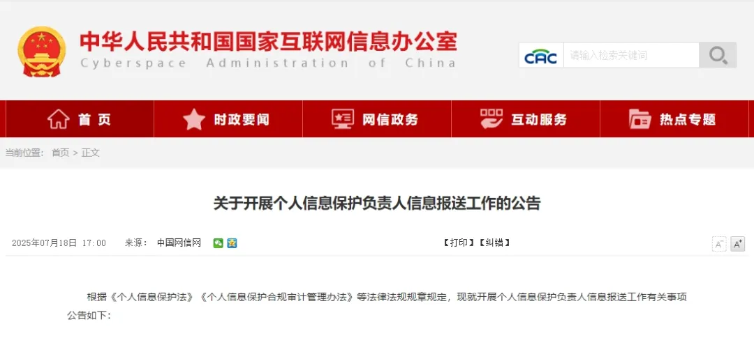 近日,国家互联网信息办公室发布公告,根据《个人信息保护法》《个人信息保护合规审计管理办法》等规定,处理100万人以上个人信息的个人信息处理者,应当向所在地设区的市级网信部门履行个人信息保护负责人信息报送手续。