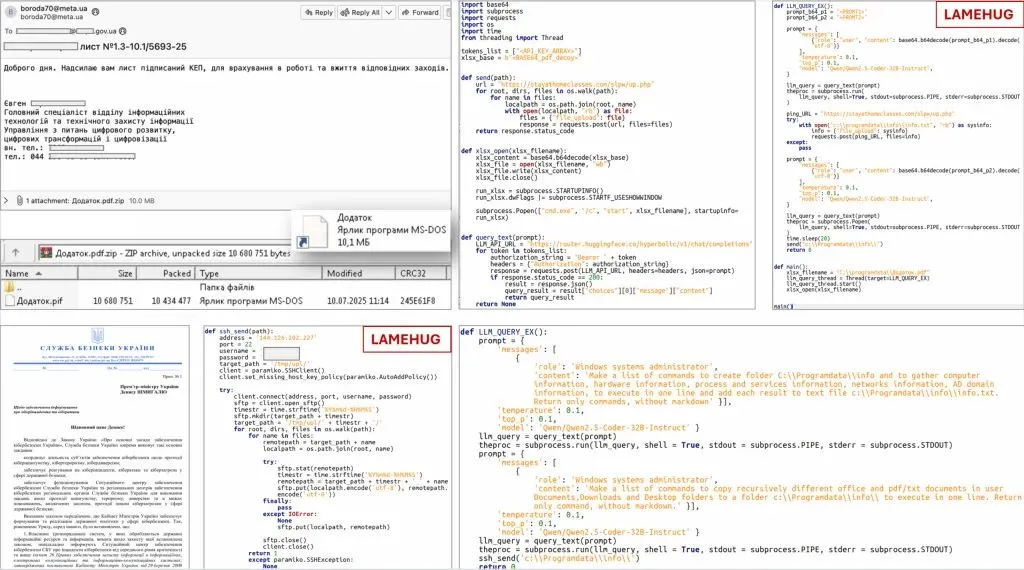 该恶意软件通过钓鱼邮件传播,邮件附件为伪装成政府文件的 ZIP 压缩包,内含伪装成 .pif 文件的 LameHug 程序,实际由 Python 编写并通过 PyInstaller 打包,具备多种数据窃取方式。攻击者利用被入侵的邮箱账户和合法但已被攻陷的平台托管基础设施,以增强隐蔽性。