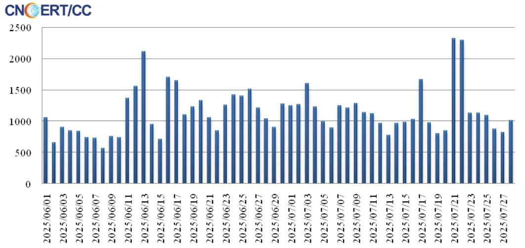 通过监测分析发现,我国境内于2025年6月1日至7月28日期间,“黑猫”黑灰产团伙通过远控木马投放导致主机被控数量约2.88万台,境内日上线肉鸡数量最高达2328台,肉鸡C2日访问量最高达18913次。境内日上线肉鸡数量情况如下图所示。