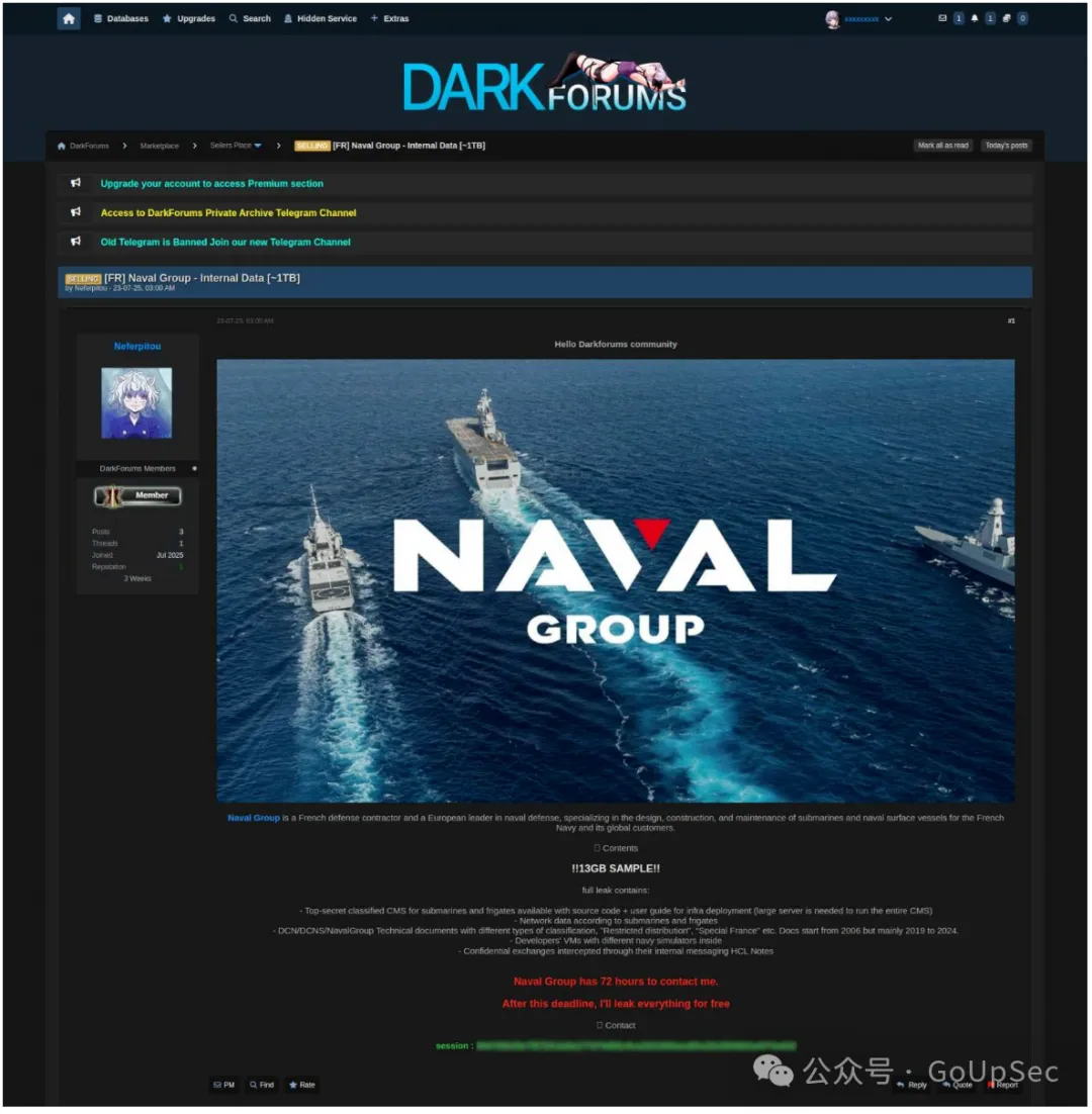 法国国有国防承包商海军集团正面临重大网络安全危机,一名黑客泄露了声称从该公司窃取的1TB数据,引起对法国国防安全的关注。事件始于7月23日,黑客“Neferpitou”在一个黑客论坛上发布了13GB的数据样本,内容涉及军舰机密信息、技术文档及内部通信记录,并要求海军集团在72小时内联系协商赎金支付。由于海军集团未响应,黑客公开了全部数据。