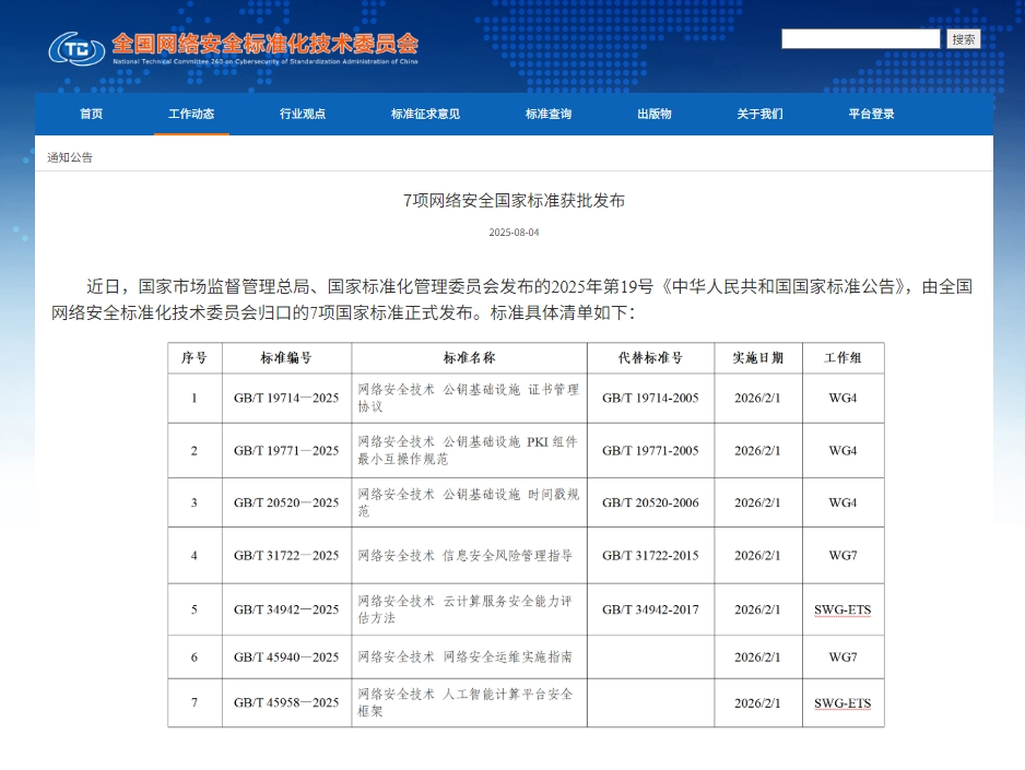 具体包括:GB/T 19714-2025《网络安全技术 公钥基础设施 证书管理协议》、GB/T 19771-2025《网络安全技术 公钥基础设施 PKI 组件最小互操作规范》、GB/T 20520-2025《网络安全技术 公钥基础设施 时间戳规范》、GB/T 31722-2025《网络安全技术 信息安全风险管理指导》、GB/T 34942-2025《网络安全技术 云计算服务安全能力评估方法》、GB/T 45940-2025《网络安全技术 网络安全运维实施指南》、GB/T 45958-2025《网络安全技术 人工智能计算平台安全框架》。