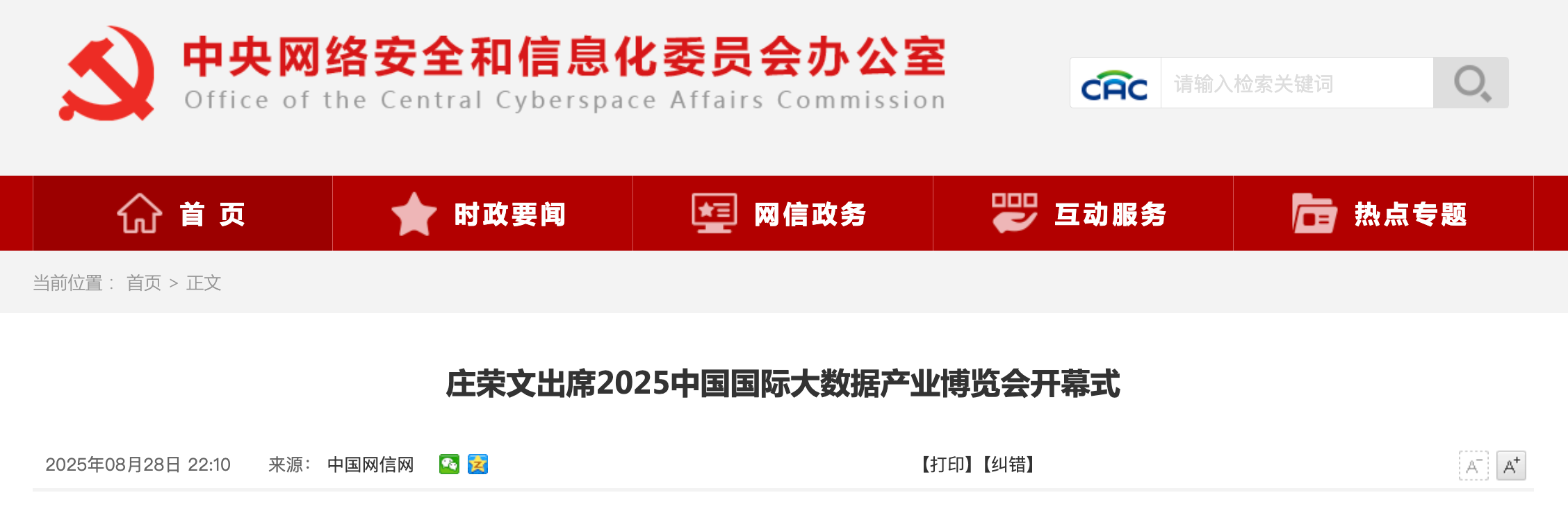 8月28日上午,中央宣传部副部长、中央网信办主任、国家网信办主任庄荣文在贵州省贵阳市出席2025中国国际大数据产业博览会开幕式并致辞。