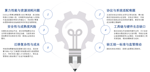 首先是,政府、军工、金融等关键领域。受政策引导与高等级安全监管驱动,政府、军工等关键领域成为优先推进PQA部署的行业,相关系统已启动混合认证机制或PQ签名的试点工作。如,美国NSA、NSA合作厂商已开始在认证系统中部署混合签名(如ECDSA+Dilithium);欧盟部分成员国政府ID系统实验PQ签名应用。这一领域将成为首批全面完成PQA迁移的行业。 部分大型金融机构也已经开展PoC验证与兼容性研究。如VISA、Mastercard、SWIFT 等与FIDO Alliance合作研究PQ认证机制,银行CA系统正在引入PQ签名兼容能力,但尚未广泛生产部署。受监管压力推动,预计在2027年前形成大规模迁移需求。 能源、电信、航空、工业控制行业:当前还处于技术评估与概念验证阶段:试点部署初步启动,部分控制系统/远程身份验证机制开始接入PQA。如,电力通信SCADA设备认证、航空MRO系统正在进行PQA可行性评估。迁移节奏受限于工业设备寿命周期,预计需更长时间部署。但由于其对远程认证、设备签名和关键基础设施安全的高度依赖,将成为紧随政府、军工、金融行业之后的重点部署行业。 其他行业:目前尚未形成系统化PQA应用,整体仍以技术储备和标准跟踪为主。如物联网、互联网平台、一般企业级身份管理场景中,受限于计算资源、协议适配能力以及缺乏强制性合规要求。多数商业企业对PQA的认知尚处于早期阶段,缺乏统一迁移计划及市场驱动力。 PQA的推广与落地尽管具备战略必要性,但在实际应用中仍面临一系列技术性、工程性、生态性的挑战与难点。详细分析可参见报告内容。