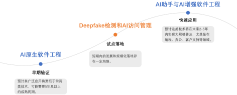 • AI增强软件工程(AI-Augmented Software Engineering):提高身份系统开发与策略管理效率,如自动生成IAM策略、身份数据处理逻辑。通过AI驱动的生命周期管理和权限审查,可降低人力审计压力,缩短响应时间。 • 网络安全AI助手(Cybersecurity AI assistants):利用生成式AI技术来发现网络安全工具中可用的现有知识,生成内容或代码,帮助安全分析师快速识别身份风险、生成响应建议,辅助治理与审计。多数情况下,网络安全AI助手是作为现有产品的配套功能提供。但也可以采用专用前端并集成AI Agent的方式来采取行动。 • AI访问管理技术(AI for Access Administration):指将人工智能技术应用于身份访问管理(IAM)及权限治理领域,以实现对访问策略的智能制定、动态调整和异常检测,从而提升访问控制的精准性、实时性与自动化水平。在人员流动频繁、访问关系动态变化的场景(如零售和电商行业、第三方临时访问等)中,对改善提升账号和权限管理的效率和有效性,改善账号过期、权限扩散或不足等问题非常友好。 • Deepfake检测(Deepfake Detection in Meeting Solutions):指为防止基于语音/图像的身份欺骗(如伪造高管发言、远程会议冒名登录等)在企业会议解决方案平台(如Cisco Webex、Google Meet、Microsoft Teams或Zoom)上加入呼叫、分析音频和/或视频内容,并提醒参与者可能的攻击。 • AI原生软件工程(AI-Native Software Engineering):通过构建以AI Agent应用为核心架构的身份系统,如自学习型IAM、持续身份风险感知系统,来实现企业端到端的流程化管理。 AI驱动数字身份技术的多样化,预示着身份安全正在从传统规则驱动型体系,开始迈向智能感知与动态决策的新阶段。 从广泛采用时间来看,AI助手与AI增强软件工程的落地应用会相对快一些。当前,AI助手(如Copilot类产品)以及AI辅助的软件工程工具发展迅速,不仅超出了早期预期,而且已展现出较强的通用性和商业可行性。受益于自然语言处理、代码生成模型和人机交互体验的持续优化,预计这类技术将在未来2-5年内实现大规模普及,尤其是在编程、办公、客户支持等领域。 相比之下,Deepfake检测、AI访问管理目前还受限于技术水平、特定场景与行业的应用需求,短期内的发展和规模化落地存在一定局限。但调研显示,这些技术在国内企业中的早期探索已经启动,并开始试点落地。AI原生软件工程 是一种新兴技术范式,目前该领域仍处于早期技术验证阶段。预计其广泛应用将滞后于前两类技术,可能需要5年及以上的成熟周期。