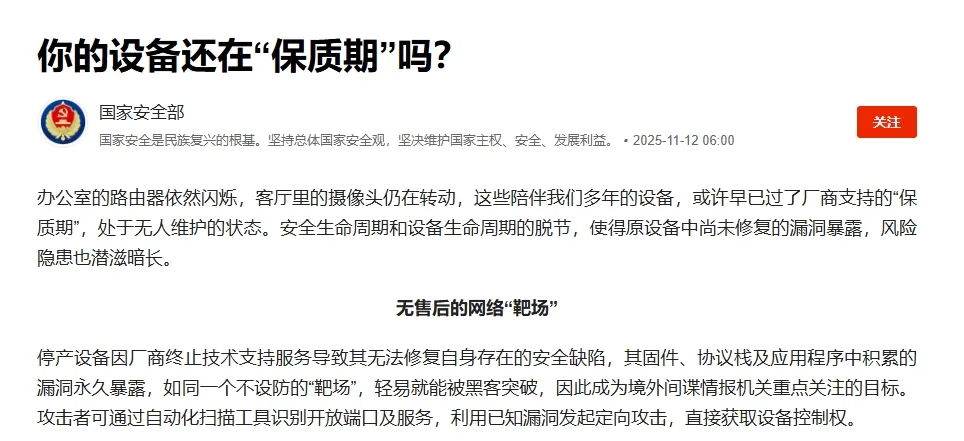 近日,国家安全部发布一则重要提醒,指出当前许多单位仍在使用的网络设备已超出厂商保修期,因缺乏安全更新、漏洞修复和有效运维,这些“超期服役”的设备正成为网络安全体系中最薄弱的“沉默缺口”。这些看似正常运转的路由器、摄像头、打印机等设备,极易被境外间谍情报机关利用,通过未修补漏洞悄然渗透,进而窃取核心数据,甚至威胁关键信息基础设施安全。