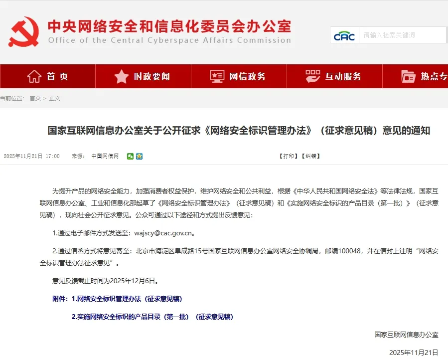 为提升产品网络安全能力,保护消费者权益与维护网络安全,依据《中华人民共和国网络安全法》,国家互联网信息办公室、工业和信息化部起草《网络安全标识管理办法》(征求意见稿)及《实施网络安全标识的产品目录(第一批)》(征求意见稿),向社会公开征求意见。公众可在2025年12月6日前,通过电子邮件(wajscy@cac.gov.cn)或信函(北京市海淀区阜成路15号,邮编100048,注明“网络安全标识管理办法征求意见”)反馈。