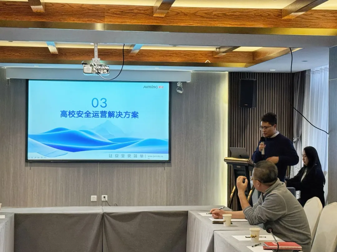 会议中场休息后,王利宝总监进一步结合南京师范大学、扬州大学、湖南中医药大学等高校的成功案例,生动解读了聚铭方案在安全事件闭环管理、网络行为溯源分析及7×24小时持续运营等方面的落地实践,为共筑防线提供了具体路径与经验参考。现场互动环节气氛热烈,多位信息中心主任就日志存储周期、安全运维人力不足、技术部署成本等关键问题展开提问,聚铭团队一一回应,并探讨后续合作可能。