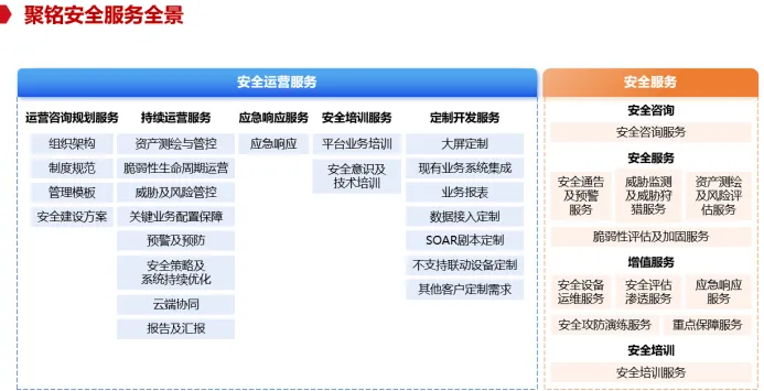 聚铭网络立足安全运营,打造可量化、可交付的安全服务能力,聚焦以下三大业务方向: