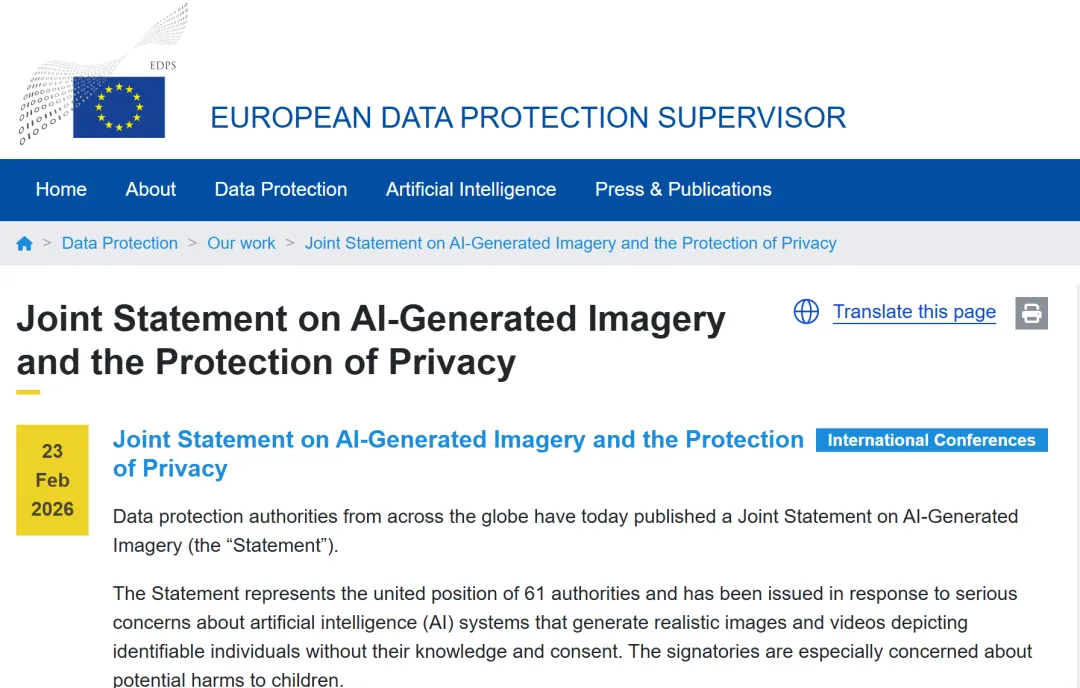 2月23日,全球多个数据保护监管机构共同发布《关于人工智能生成图像与隐私保护的联合声明》(以下简称“声明”)。