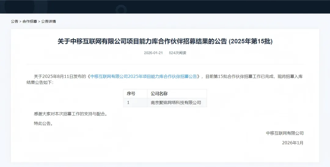 近日,中移互联网有限公司正式公布项目能力库合作伙伴招募结果(2025年第15批),聚铭网络凭借自身在网络安全领域深厚的技术积淀与服务优势,从众多参选企业中脱颖而出,成功入围。