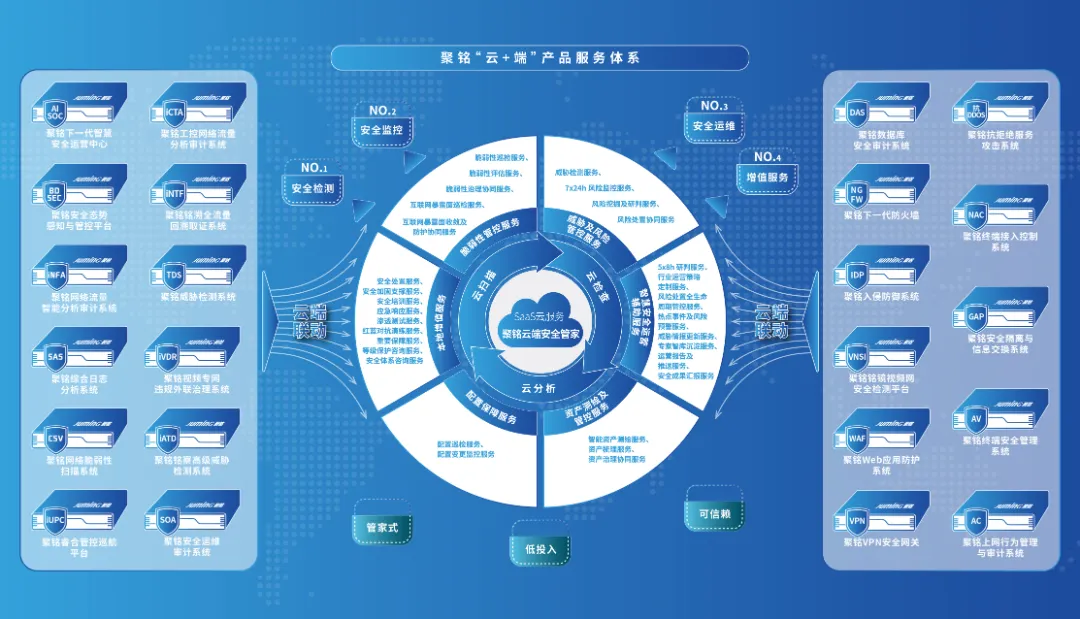 作为国内专业的安全运营商与安全产品供应商,聚铭网络自成立以来便专注于网络安全智能分析与检测。公司构建了完备的“云+端”产品体系,全面覆盖安全托管、安全管理、安全审计等核心场景,可在资产运维、漏洞识别与治理、合规监管等关键环节提供高效支撑,实现客户资产安全的全方位管控与持续优化。