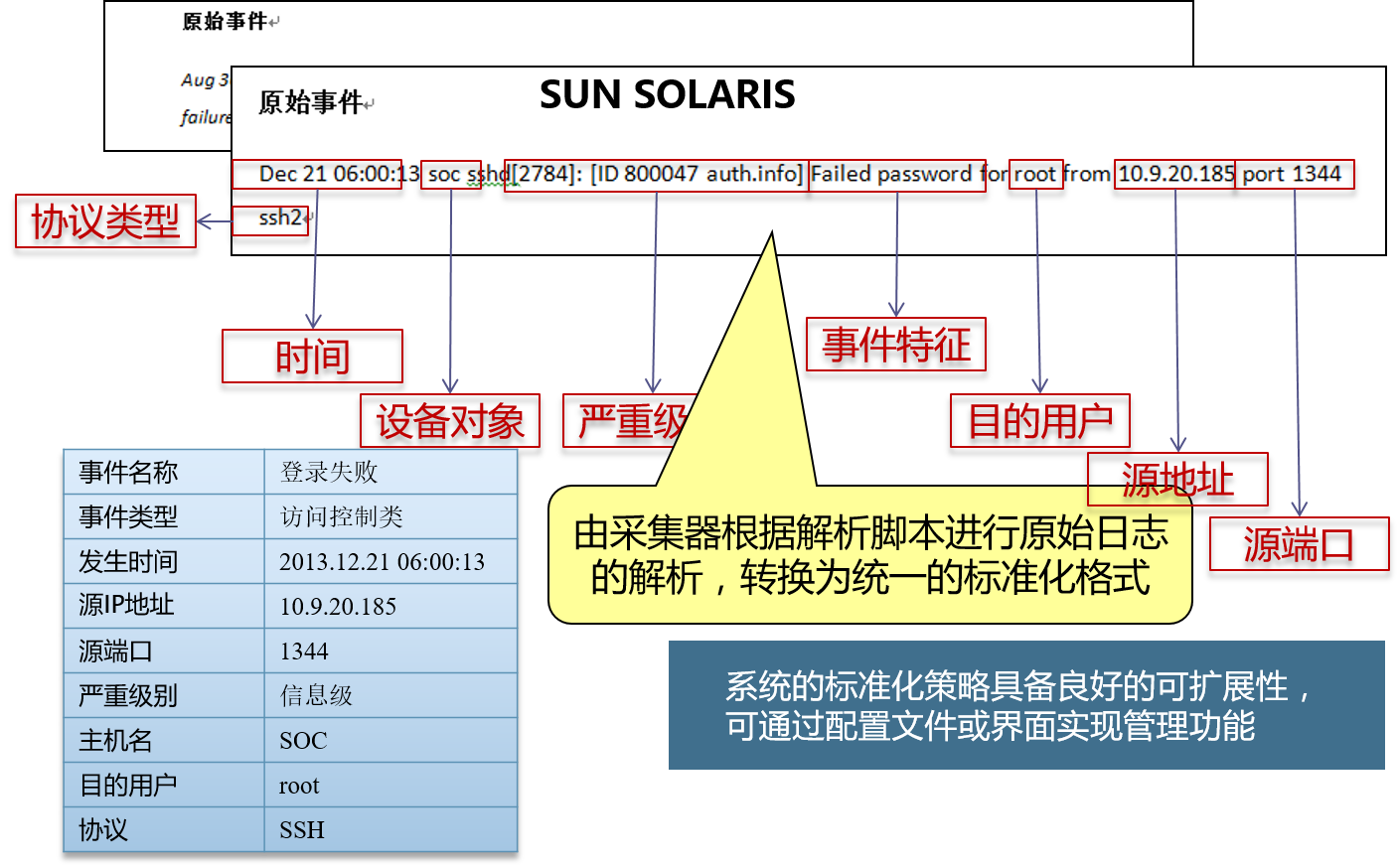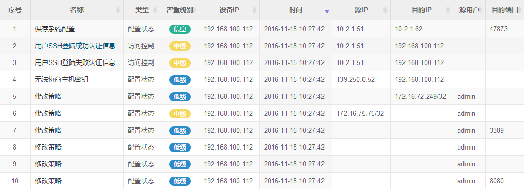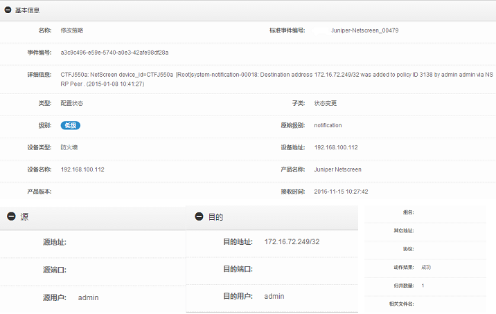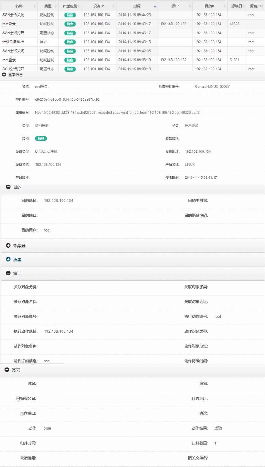 日志分析系统收集到设备日志后,对日志进行标准化,记录日志的日期和时间、源用户、目的用户、事件类型、结果、源地址、源端口、目的地址、目的端口等相关信息。