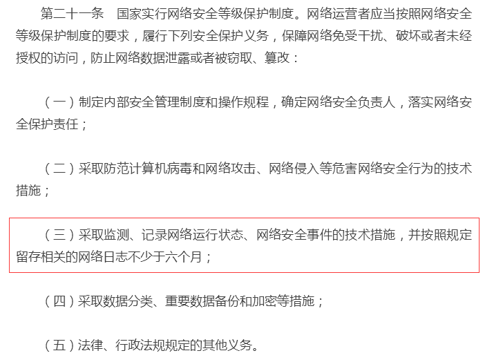 (三)采取监测、记录网络运行状态、网络安全事件的技术措施,并按照规定留存相关的网络日志不少于六个月;