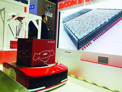 由无人机、无人车、无人仓共同构成的京东智慧物流亮相第三届世界互联网大会,图为展出的模拟无人仓。苏德悦/摄